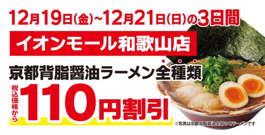 この度オープンを記念して、「イオンモール和歌山店」にご来店いただいたお客様には、『京都背脂醤油ラーメン全種類』を税込価格から110円割引で販売いたします。
