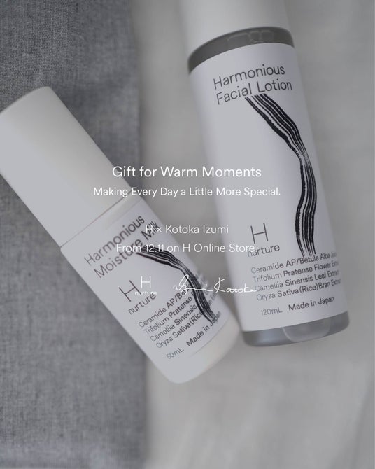 H はその力に着目し、和栗の皮から抽出したヒト型セラミド*を配合。角質層のすみずみにうるおいを届け、水分をしっかり抱え込み、乾燥やゆらぎに強いすこやかな肌へ導きます。肌のキメを整え、毛穴の目立ちにくい印象に。“うるおいを与える、育てる”という新しいスキンケアのかたちを提案します。