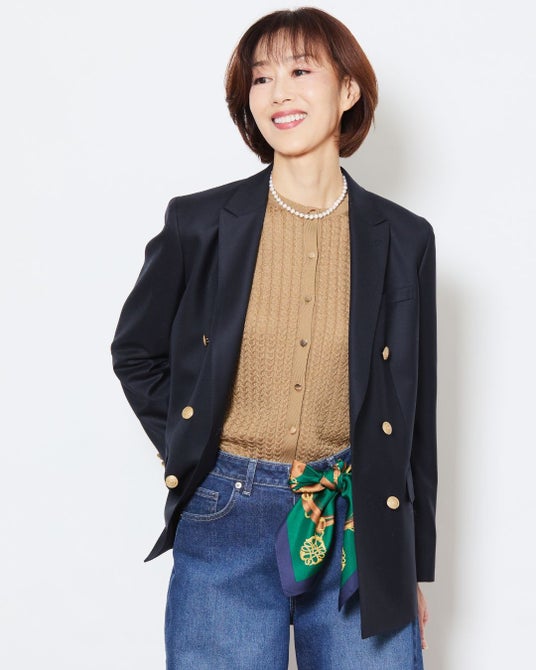 デニムにブレザーを合わせた、大人カジュアルの王道。スカーフのアクセントが、シンプルな装いをモダンに引き上げます。