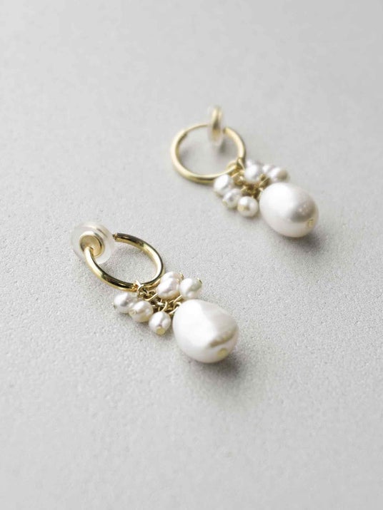 小さな淡水パールの下にオーバル型の淡水パールをひと粒あしらった、小ぶりなフープピアス・イヤリングです。淡水パールならではのやわらかなツヤ感が、耳元にやさしい表情を添えてくれます。シンプルで上品ながら、女性らしい愛らしさを感じられるデザインに仕上げました。