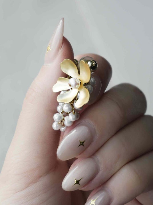 ゴールドのお花とまるい淡水パールを組み合わせたロングピアス・イヤリングです。お花のきらりとした輝きと淡水パールのやわらかな甘さが、耳元に華やかさと上品さを添えてくれます。特別な日には華やかに、普段の装いにも自然になじむアクセサリーです。