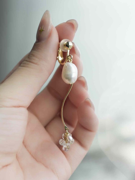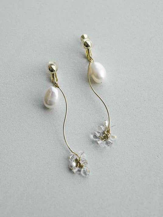 ひと粒のオーバル型の淡水パールとウェーブパーツの下で揺れる水晶と淡水パールが、耳元に優しい印象を与えるピアス・イヤリング。なめらかなウェーブが柔らかで上品な雰囲気を演出します。ピアスのみ2way仕様で、キャッチを付け替えれば、シンプルにも華やかにも楽しめます。