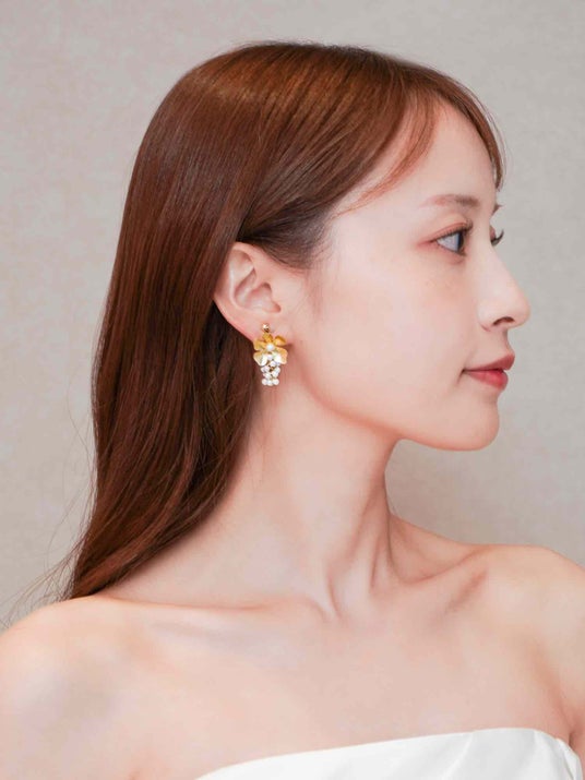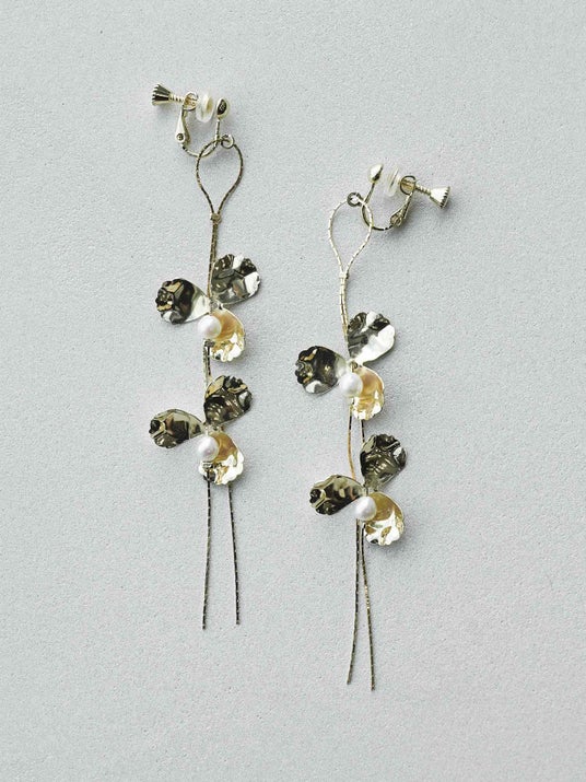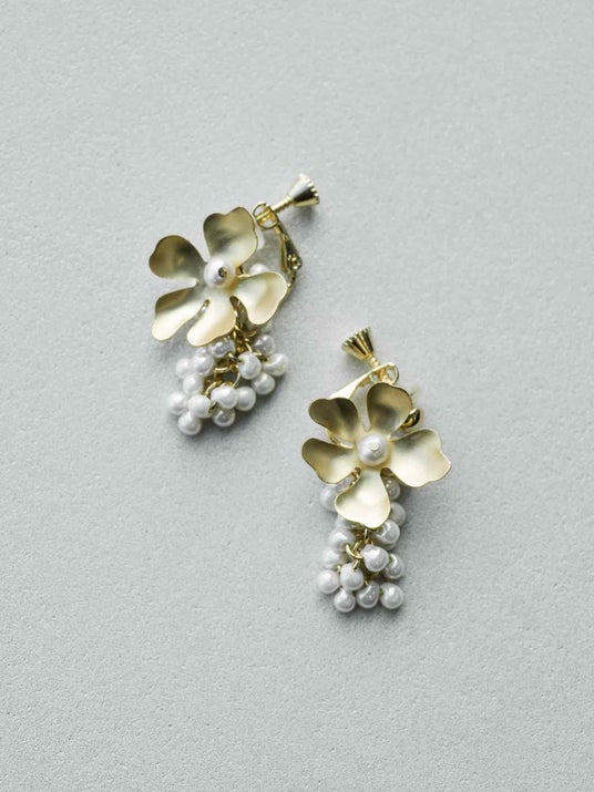 マットゴールドのお花の中央に淡水パールをあしらいました。お花の下には艶のあるホワイトビーズを飾り、耳元で軽やかに揺れるデザインです。あたたかみのあるゴールドの色味とビーズの柔らかな質感が、女性らしい雰囲気を演出します。