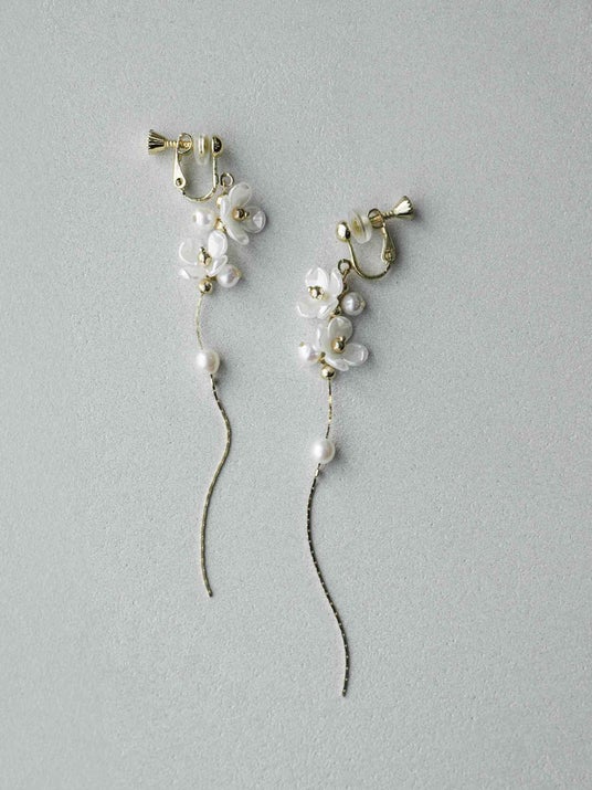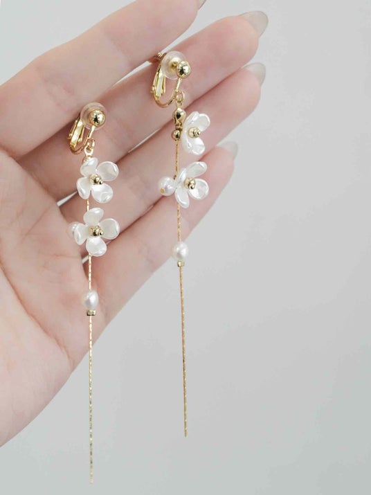 小さなホワイトフラワーとまるい淡水パールを組み合わせた、可憐で華奢な印象のロングピアス・イヤリングです。繊細なディテールが、耳元に軽やかさと上品なきらめきを与えてくれます。