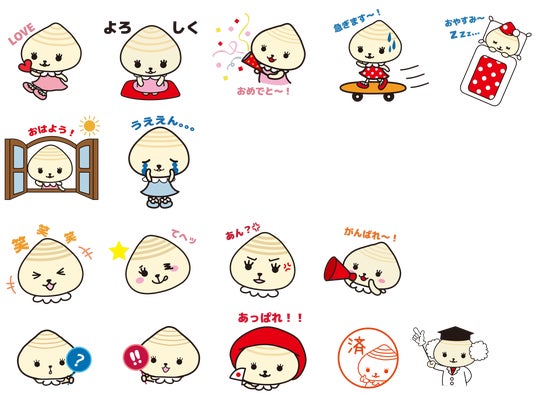 「はまぐりちゃん」は、はまぐりの頭を持つ、やさしく明るい性格の女の子のキャラクターです。今回リリースされたスタンプは、日常会話で使いやすい挨拶や感情表現を中心に、全16 種類をご用意。ご家族やご友人とのコミュニケーションを、より楽しく彩るアイテムとしてご活用いただけます。