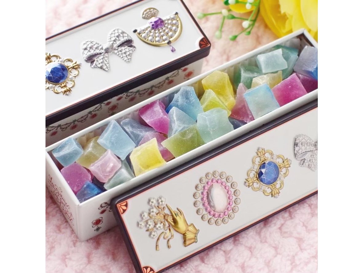 <魔法の琥珀糖>の一番人気フレーバー「プレーン」を美しい宝石缶に閉じ込めました。開ける前から美しい、大変人気のデザイン缶です。中には色とりどりの宝石のような琥珀糖が詰められているので、ギフトにも喜ばれること間違いなし。