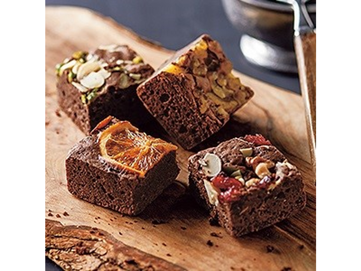 濃厚なチョコレートの生地に、香ばしいナッツや甘酸っぱいフルーツをトッピング。ピスタチオとアーモンド、ごろっとしたパイナップルやネーブル、たっぷりのドライフルーツとナッツなど、おいしさをぎゅっと詰め込んだキューブが、小さな幸せをお届けします。