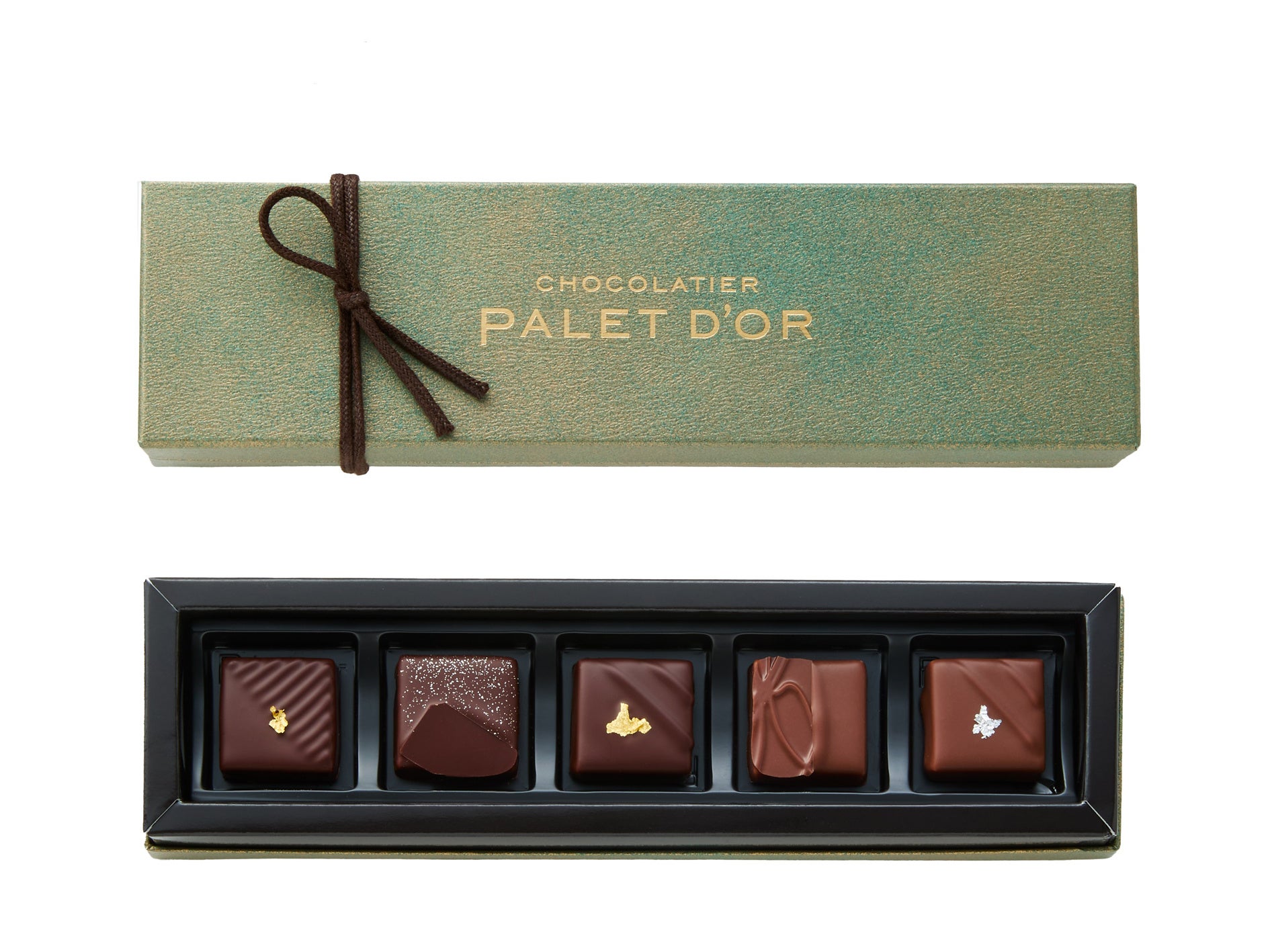 「温故知新」「レトロモダン」をテーマに、伝統菓子を現代風に再構築したフランス菓子や、パリスタイルの華やかなデコレーションなど、独創性を表現している、東京・恵比寿のパティスリー<レザネフォール>。一粒ひと粒丁寧に作られた味わいや食感が楽しめるショコラ4種(ショコラコンカッセ、アマンドショコラ、ノワゼットショコラ、オランジェット)が詰められた一箱です。