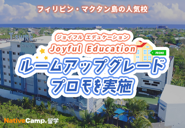 ネイティブスピーカーと回数無制限のオンライン英会話サービス「ネイティブキャンプ英会話」を展開する株式会社ネイティブキャンプ(東京都渋谷区 代表取締役: 谷川国洋)は、海外留学エージェントサービス「ネイティブキャンプ留学」において、フィリピン・マクタン島の人気校「Joyful Education」にて、ルームアップグレードプロモを実施いたします。