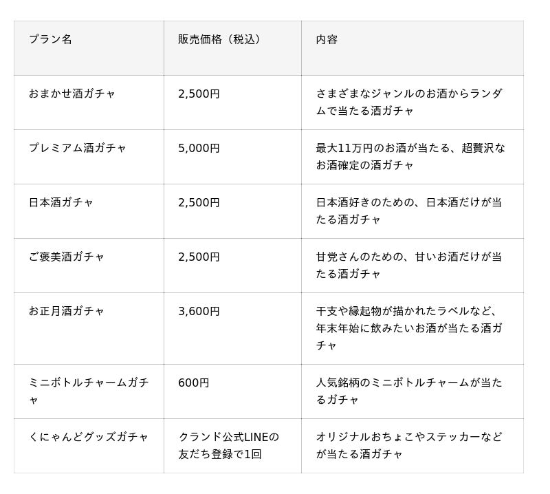 当たるお酒のラインアップには1本110,000円(税込)の、50年熟成酒粕焼酎「神響 shinkyo 50年」や、1本55,000円(税込)の30年熟成させた日本酒「天琥 -tenko- 30年」など、一般販売していないレアなお酒も入ります。他にもクランド公式LINEを友だち登録すると回せる、「くにゃんどグッズガチャ」も登場します。