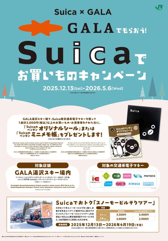 GALA湯沢スキー場の対象店舗で、Suica等交通系電子マネーを使って1会計2,000円(税込)以上のお買いもの・お食事等をされた方に、「Suicaのペンギン オリジナルシール」または「Suicaのペンギン ミニメモ帳」をプレゼントします。