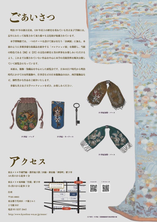 130年以上の歴史を持つ共立女子学園の貴重な服飾・染織コレクションから、当館の特色である【和】と【洋】の文化の歴史と美の世界を初公開の資料を中心に展示いたします。