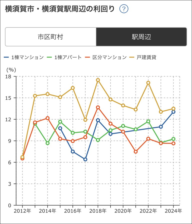 これまで楽待の物件情報ぺ-ジにおける「平均利回り」の推移については、市区町村別のデータを提供してきましたが、今回のアップデートにより、より細かな単位である「駅別」での相場確認ができるようになりました。