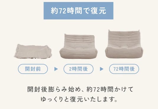 「箱を開けた瞬間はコンパクト、設置後はしっかり快適」。圧縮梱包ならではの驚きと利便性を兼ね備えた、新しいソファ体験を提供します。