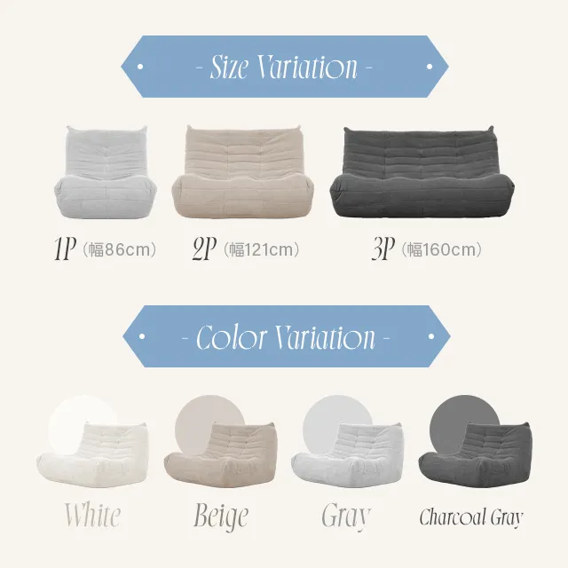 ワンルームからファミリー世帯まで、幅広い住環境に対応できるよう3サイズをご用意。さらに、インテリアに合わせて選べる4色のカラーバリエーションを展開しています。お部屋の広さや使い方に合わせて選べるため、圧迫感なく空間にフィット。ライフスタイルの変化にも寄り添う、柔軟性の高いソファです。