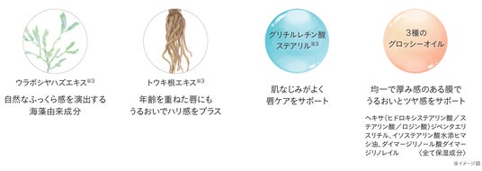 さらに、ウラボシヤハズエキス(※2)/トウキ根エキス(※2)/グリチルレチン酸ステアリル(※2)/3種のグロッシーオイルなど、敏感な唇にうれしい保湿成分を厳選しました。