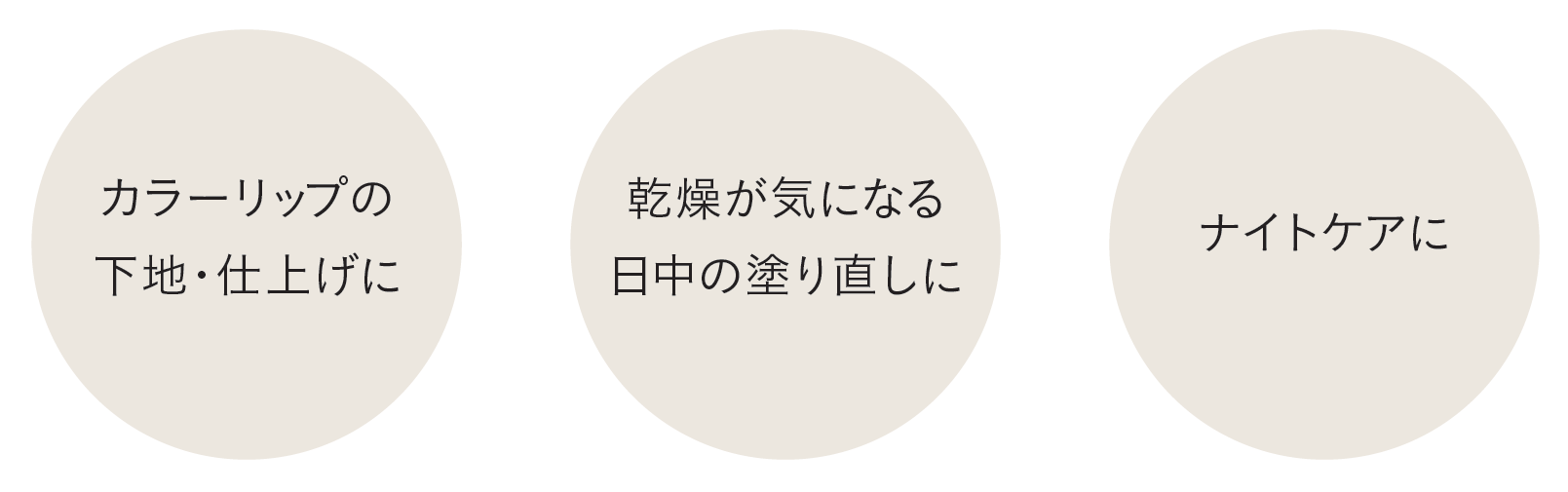 口紅の下地としても仕上げとしても使えるほか、日中の乾燥が気になる時やナイトケアにもお使いいただけます。