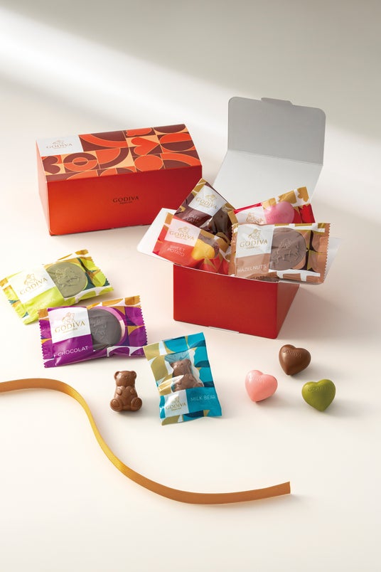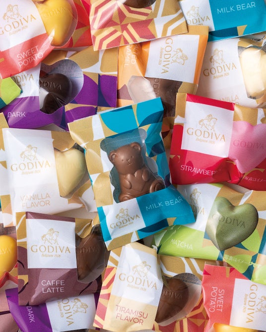 ハート形のチョコレートは、ゴディバのチョコレートをシンプルに味わえるミルクチョコレートや、期間限定の安納芋スイートポテト味などの全10種類。可愛らしいクマの形の「ジョイフルミックス ミルク ベア」は、メッセージやデザインが異なる4種類あり、レアなデザインのチョコレートを探す楽しみもあります。小さなフィンガーケーキ風焼菓子「プティガトー」は、こだわりのチョコレート、ビスキュイ、なめらかなソース、3層の異なる味わいと食感が織りなす贅沢な味わいです。自宅用の袋の他、カジュアルギフトに使える専用のギフトボックスもご用意しています。自由に選べる、自分だけの詰め合わせをお楽しみください。