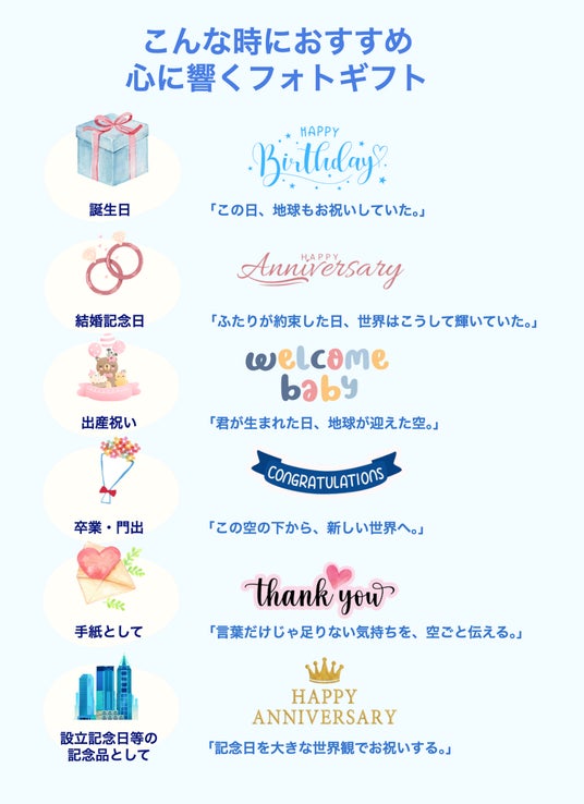「宙(そら)からの贈りもの アニバーサリー・フォト」は、さまざまな人生のシーンで選ばれています。