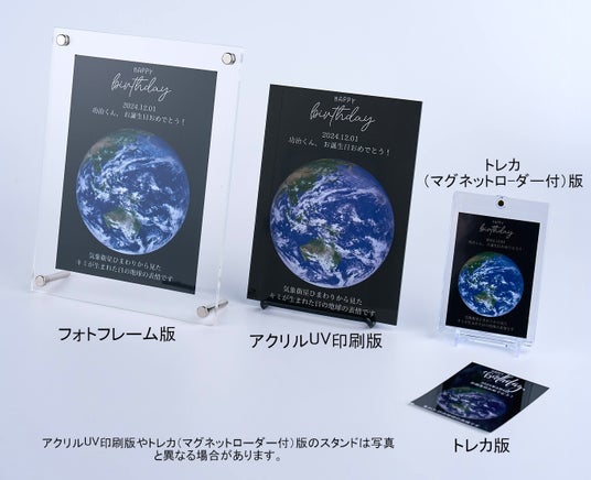 株式会社三隆国際気象(本社:兵庫県西宮市)は、人生の記念日を「その日の地球の姿」とともに残すフォトサービス「宙(そら)からの贈りもの アニバーサリー・フォト」において、フォトフレーム版またはアクリルUV印刷版のご注文で、同デザインのトレカ版をお付けする期間限定の取り組みを実施しています。