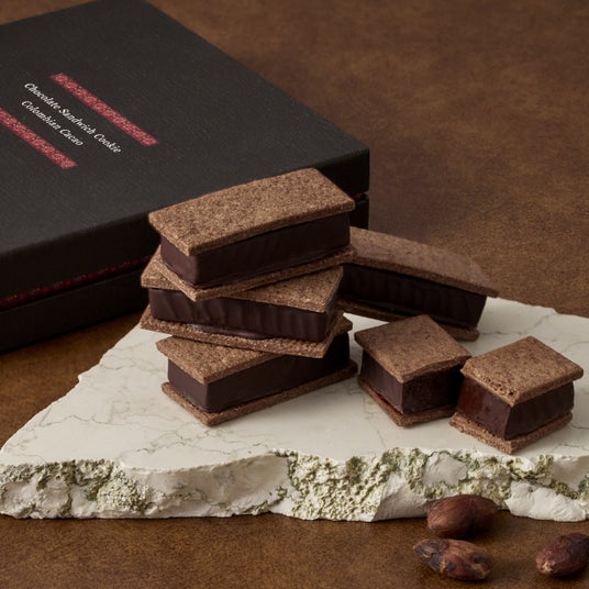 フルーティーで華やかな香りを持つコロンビア産カカオのチョコレートを使用した、大人のためのショコラサンドクッキー。パリッとした薄いチョコレートの中から感じる、ガナッシュの滑らかなくちどけ。サクッとした薄焼きクッキーから漂う香ばしいカカオの香り。コロンビアンカカオの濃厚でほろ苦いおいしさが、口の中でゆっくりととろけていきます。コク深い味わいと豊かな余韻をぞんぶんにご堪能ください。