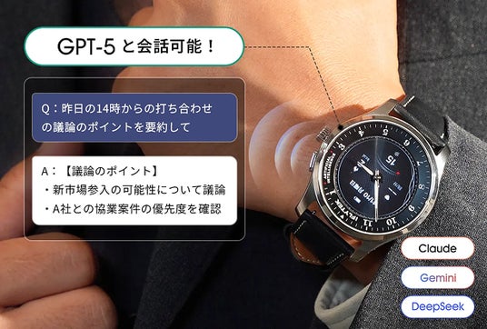 AI呼び出しボタンを長押しすれば、GPT-5を呼び出せます。簡単な質問や指示を行い、リューズをクリックすれば、即座に回答・対応。他にもGemini、Claude、DeepSeekを搭載することで仕事の神効率化を実現。