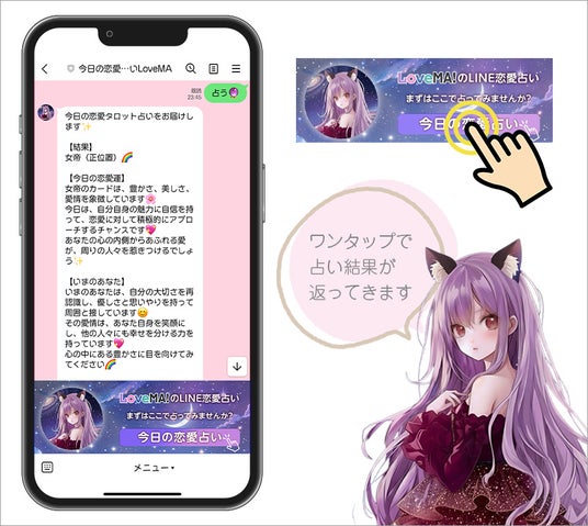 本サービスは、面倒な会員登録やアプリのインストール不要で、LINE上で手軽に利用できる「メンタルケア×占い」サービスです。恋愛心理学の知見とタロットを掛け合わせ、ユーザーの心を整えるメッセージと、今日実践できる具体的な行動指針を無料で提供します。