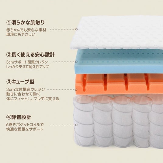 日本人の体格や寝姿勢に合わせて設計された、最適なマットレス。穴あきメモリーフォームを採用し、優れた通気性でムレにくく、一晩中快適。3D立体構造ウレタンと独立スプリングが体をしっかり支えつつ、体圧を均等に分散し、快適な睡眠環境をお届け。