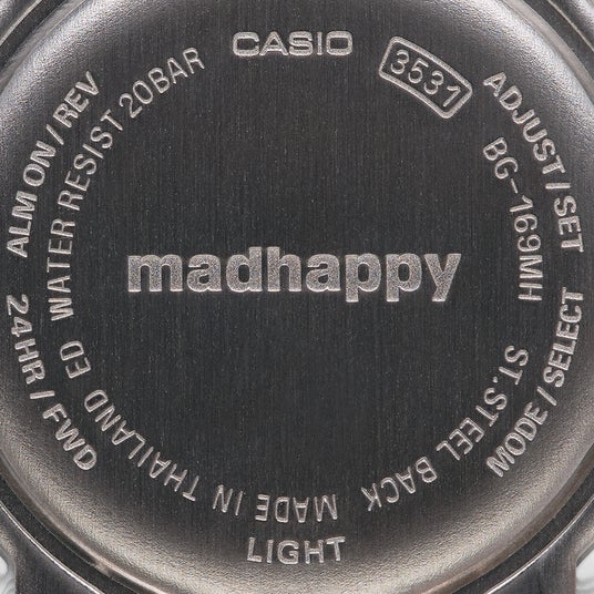やわらかなピンクの文字盤と、クリーンなホワイトのケース&バンドのコントラストが、明るく軽やかな印象を演出。裏蓋にはMadhappyのロゴを刻印し、LEDバックライトを点灯させると、LCDディスプレイ上にMadhappyロゴのシルエットが浮かび上がる特別仕様となっています。さらに、本コラボレーション限定のカスタム・コーブランディングパッケージが付属します。