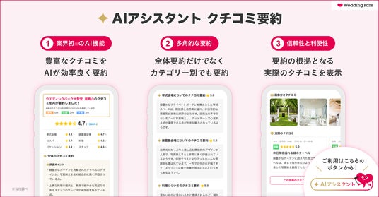 ※3:国内のウエディングメディアにおいて、クチコミデータを「生成AI」が要約する機能として業界初(2025年12月 自社調べ)