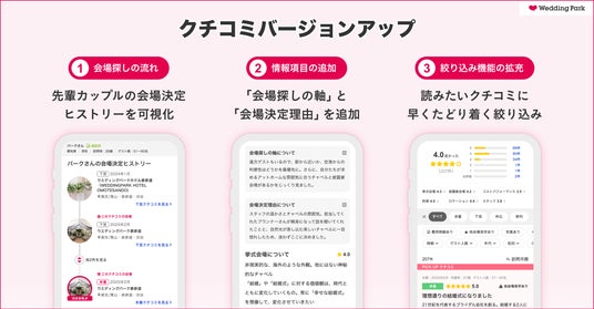 株式会社ウエディングパークが運営する結婚準備クチコミ情報サイト「Wedding Park」は、2025年12月18日より、クチコミの利用体験を刷新する「クチコミバージョンアップ」と、生成AIを活用した新機能「AIアシスタント『クチコミ要約』」を同時にリリースしました。この2つの機能により、国内最大級のクチコミ情報から、ユーザーが効率的かつ多角的に情報をインプットし、「自分たちらしい基準」に基づいた確信のある意思決定ができるようサポートします。