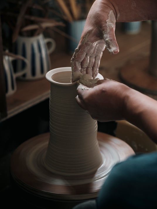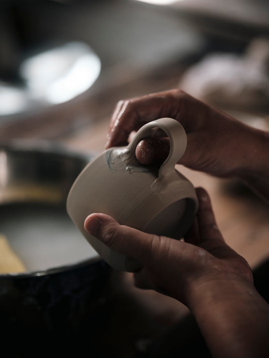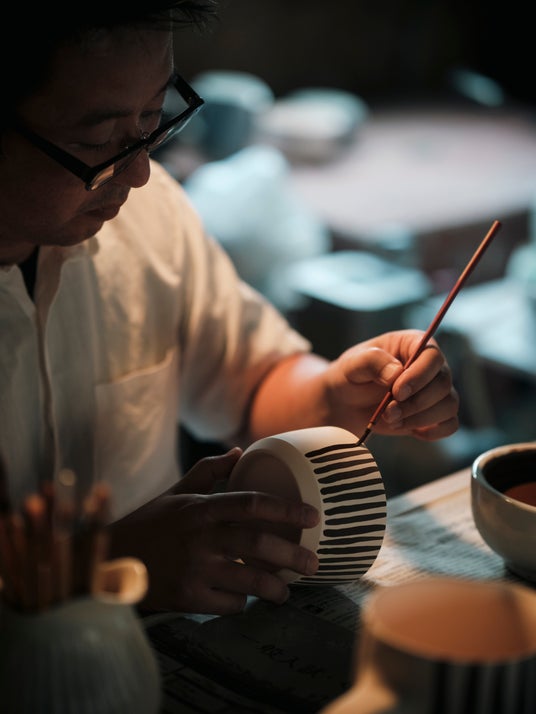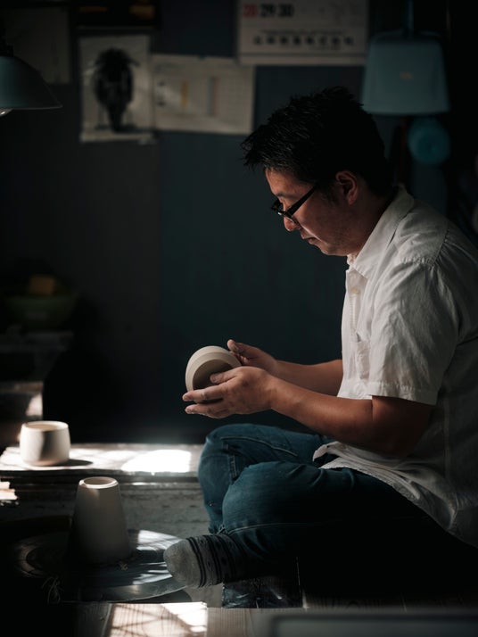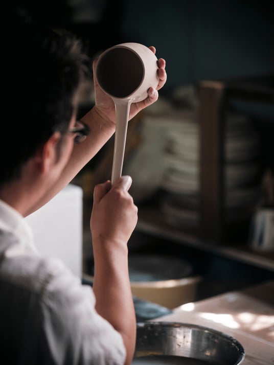 益子の工房で修業し、二十代半ばに独立してから器をつくり続ける夜日窯・玉木一将さん。「自分が良いと思える形」を追求し制作を続けています。現在扱う土を選ぶ決め手は、白色度、透光性、そしてロクロでの扱いやすさ。産地よりも、手にしたときの素直さを大切にしており、制作で最も神経を使うのは、成形後の乾燥や釉薬の手順、火を止める一瞬の判断。静かだが緊張感のある工程が、器の清らかな佇まいを生んでいます。形を決める基準は「自分が見てきれいと感じるかどうか」。何かに美しいと感じることが創作意欲となり、長く使えるよう飽きのこない落ち着いた佇まいを大切にしているといいます。