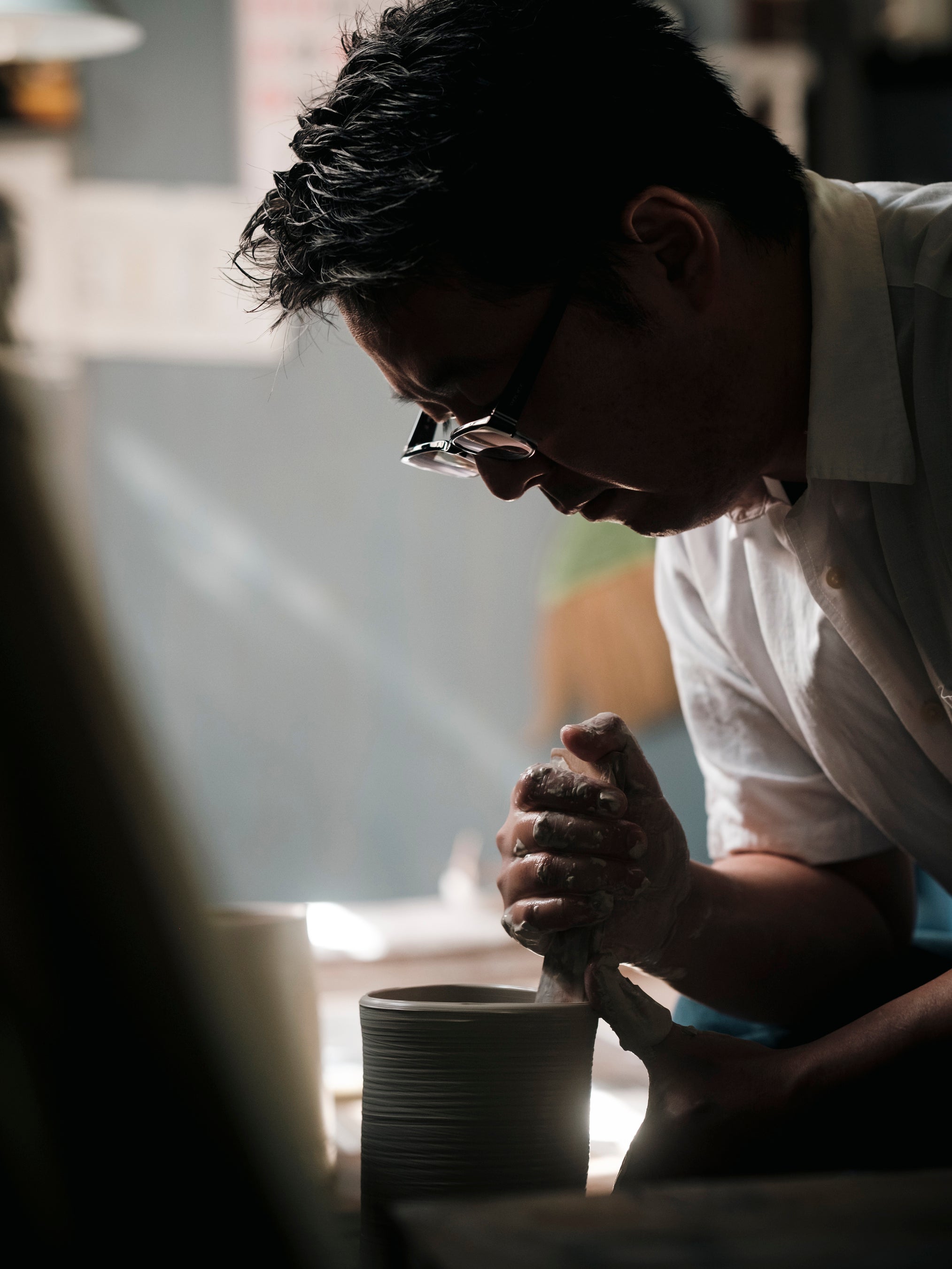 益子の工房で修業し、二十代半ばに独立してから器をつくり続ける夜日窯・玉木一将さん。「自分が良いと思える形」を追求し制作を続けています。現在扱う土を選ぶ決め手は、白色度、透光性、そしてロクロでの扱いやすさ。産地よりも、手にしたときの素直さを大切にしており、制作で最も神経を使うのは、成形後の乾燥や釉薬の手順、火を止める一瞬の判断。静かだが緊張感のある工程が、器の清らかな佇まいを生んでいます。形を決める基準は「自分が見てきれいと感じるかどうか」。何かに美しいと感じることが創作意欲となり、長く使えるよう飽きのこない落ち着いた佇まいを大切にしているといいます。