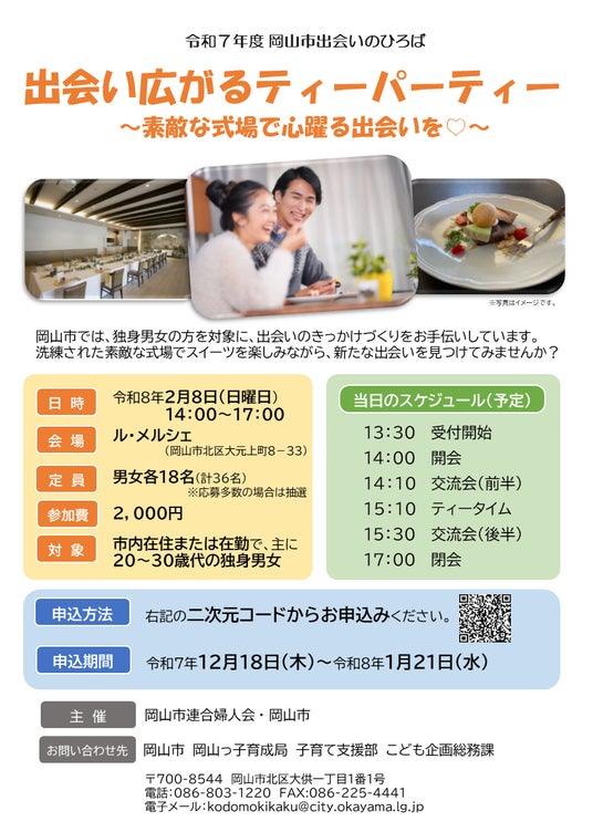 【岡山市及び岡山市連合婦人会共催】岡山市では、結婚を希望する若者を対象に、出会いのきっかけづくりをお手伝いしています。洗練された素敵な式場でスイーツを楽しみながら、新たな出会いを見つけてみませんか?