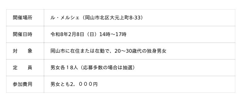 【岡山市及び岡山市連合婦人会共催】岡山市では、結婚を希望する若者を対象に、出会いのきっかけづくりをお手伝いしています。洗練された素敵な式場でスイーツを楽しみながら、新たな出会いを見つけてみませんか?