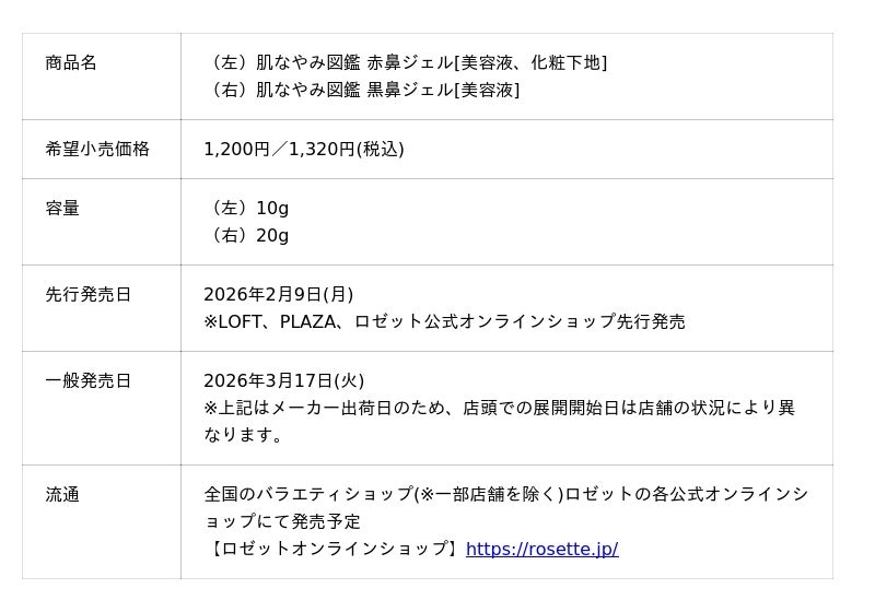 ロゼット株式会社(本社:東京都品川区、代表取締役社長:藤井 敬二)が展開する『Rz+ by ROSETTE』(アールゼットプラス バイ ロゼット)の新ブランド「肌なやみ図鑑」から、「小鼻の赤みカバー*1」と「小鼻のポツポツくすみ*2」に着目した2つの鼻用アイテムが登場いたします。2026年2月9日(月)よりLOFT、PLAZAおよびロゼット公式オンラインショップにて先行発売、3月17日(火)からは全国のバラエティショップ(一部店舗を除く)で順次販売を開始いたします。メイク前に塗るだけで小鼻まわりの赤みをカバー*1しながら皮脂ケアできる化粧下地「肌なやみ図鑑 赤鼻ジェル」と、就寝前に塗るだけで毛穴のポツポツくすみ*2をケアする美容液「肌なやみ図鑑 黒鼻ジェル」の2つのラインナップで展開。気になる肌悩みに合わせて、あなたにぴったりのケアを選んでください。