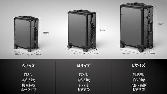 同じ30~40L級・機内持ち込みクラスで、カーボン外装×アルミ合金フレームという同条件の製品を比較しても、当社モデルは約3.5kgと最軽量級に位置します。一般的な同カテゴリー品が4~5kgに分布する中で、この差は数字以上に体感として現れます。スーツケースが軽いというだけで、旅の質は大きく変わります。