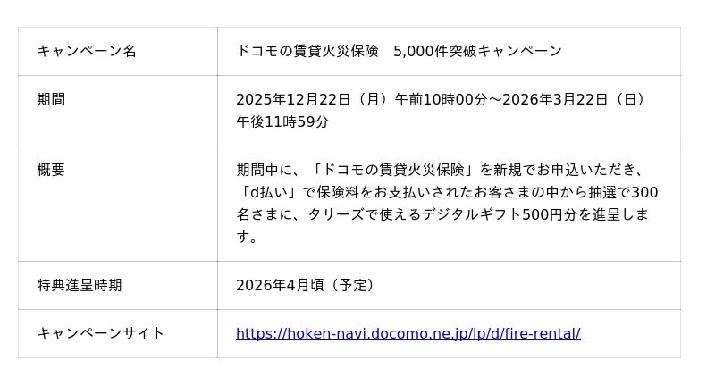 ドコモは、本保険の累計販売件数が5,000件を突破したことを記念して、タリーズで使える500円分のデジタルギフトが当たる「ドコモの賃貸火災保険 5,000件突破記念キャンペーン※5」を2025年12月22日(月)から2026年3月22日(日)まで開催します。