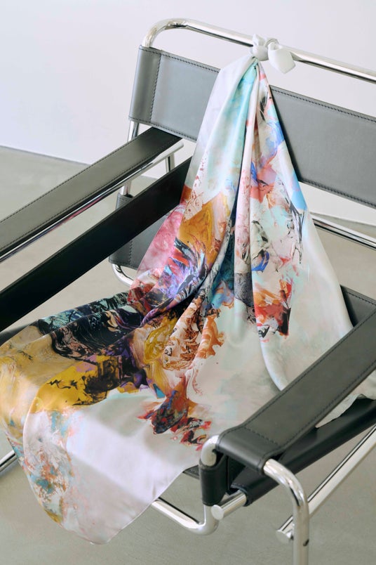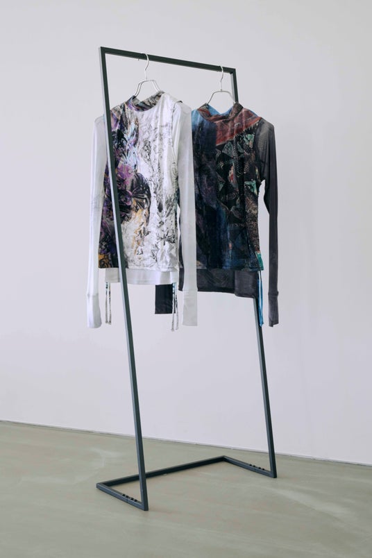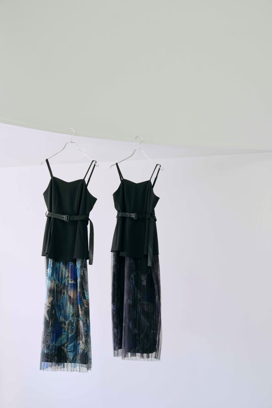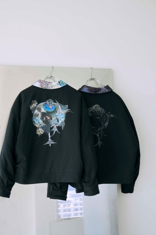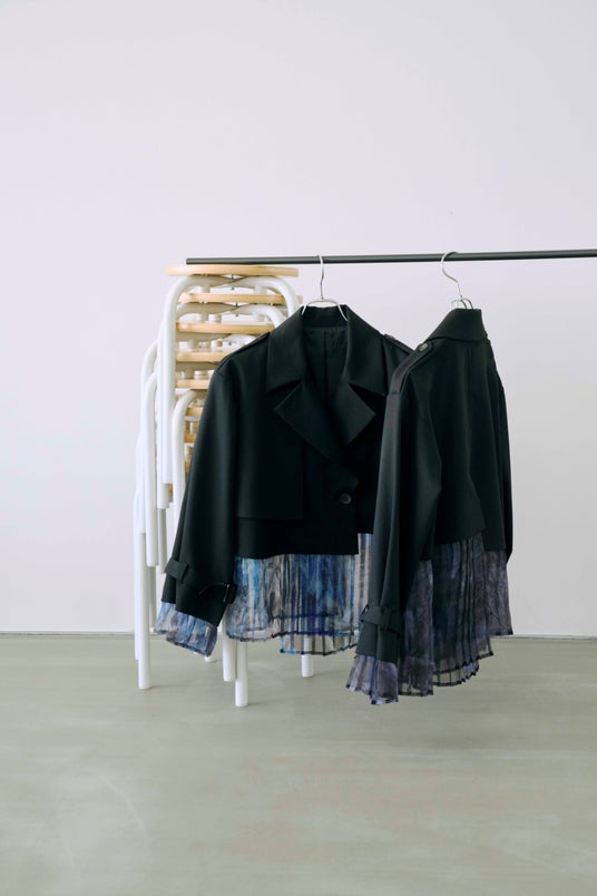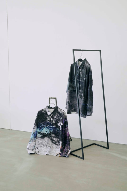 今回のコラボレーションでは、川崎氏の精彩なグラフィックを袴のようなプリーツデザインや、シアー素材の重なりが美しいレイヤードデザインなど、どこか和のテイストを感じるデザインのアイテムへ落とし込みました。