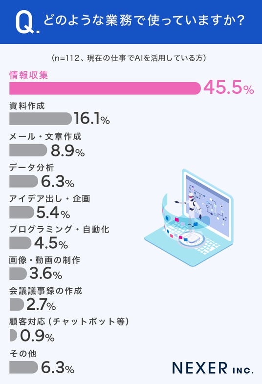 「情報収集」が約45.5%と最も多く、AIを調べるツールとして利用する傾向が強いことが分かります。