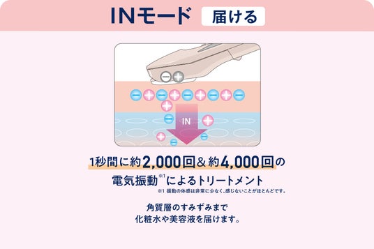 肌の汚れを落とすOUTモードと、うるおいを届ける※1 INモードを搭載しており、電気振動※2によるトリートメントでクレンジングや洗顔で落としきれない汚れをオフし、化粧水や美容液の浸透※1をサポートします。肌のざらつきやくすみ※3、乾燥が気になる方におすすめです。