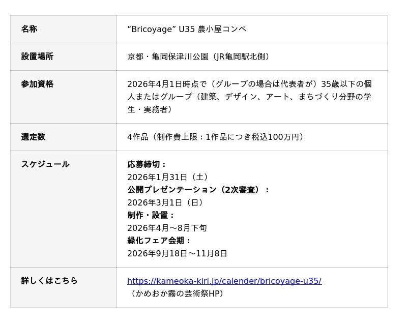 京都府亀岡市(亀岡市長 桂川孝裕)が事務局をつとめる、かめおか霧の芸術祭実行委員会(会長:佐々木京子亀岡市副市長)は、来年秋に開催される国内最大規模の花と緑の祭典「全国都市緑化フェアin京都丹波(以下、緑化フェア)」を契機とし、会場となる京都・亀岡保津川公園に設置する「農小屋」のデザインおよび制作を担う若手クリエイター(35歳以下)を2025年12月12日より公募しています。本コンペティションでは、亀岡市の田園風景に溶け込みつつ、人と自然の交差点となる「小屋」を募集します。選出された4組には制作費(上限100万円)が支給され、実際に設置された小屋は緑化フェア期間後、アート作品として公園に設定する予定です。