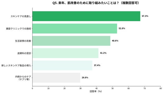 来年、肌改善のために取り組みたいことを調査したところ、「スキンケアの見直し」が67.3%で最多、次いで「美容クリニックでの施術」が52.8%で2位となりました。
