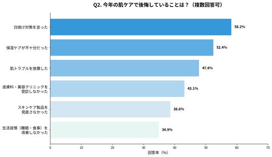 今年の肌ケアで後悔していることを調査したところ、最も多かったのは「日焼け対策を怠った」(58.2%)で、次いで「保湿ケアが不十分だった」(52.4%)、「肌トラブルを放置した」(47.8%)という結果になりました。