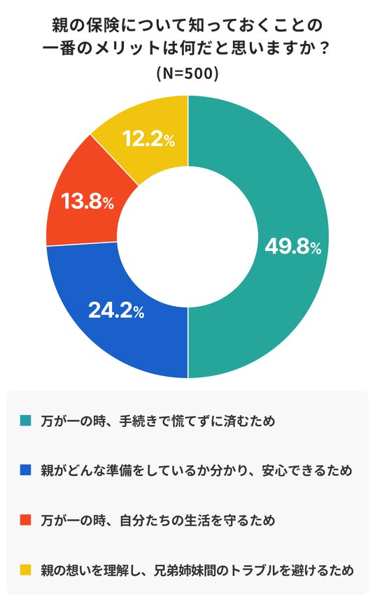 「親の保険について知っておくことの一番のメリットは何だと思いますか?」という質問に対しては、安心感などの情緒的な理由ではなく、「万が一の時、手続き等で慌てずに済むため」(49.8%)という実務的な理由が1位でした。