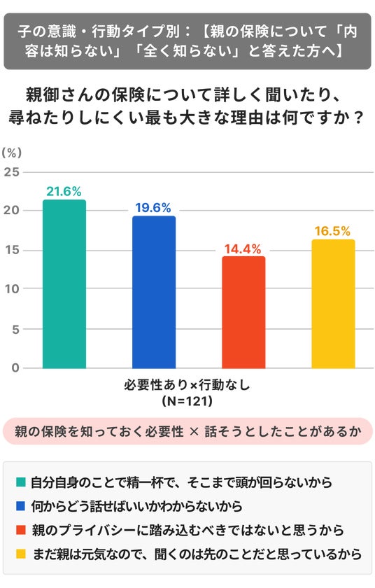 親の保険について知ることの「必要性を感じているか」と話そうと「行動したか」で回答者を分類し、必要性を感じつつも話そうとしたことはない層に尋ねにくい理由を聞くと、「自分のことで精一杯(21.6%)」や「何から話せばいいかわからない(19.6%)」といった回答が上位にあがりました。
