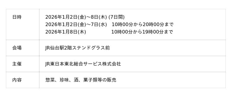 JR東日本東北総合サービス株式会社(本社:宮城県仙台市、代表取締役社長:弭間 俊則)は、JR仙台駅2階ステンドグラス前において、「新春笑福フェア」を開催します。
