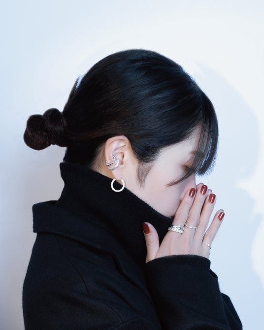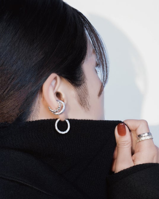 サイズ違いのデザインはレイヤードで個性をプラス。イヤーカフは開閉式のデザインで、お好みの位置で着用できます。