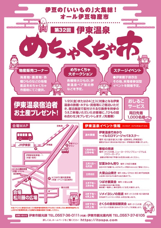 伊東市(庁舎:静岡県伊東市、市長:杉本憲也)は、令和8年1月24、25日に松川藤の広場(静岡県伊東市渚町1)で「第32回伊東温泉めちゃくちゃ市」を開催します。