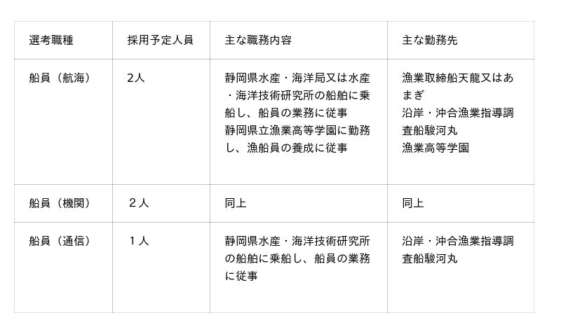 静岡県では、水産・海洋技術研究所の漁業指導調査船など、本県所属の船舶に乗船し船員の業務に従事する乗組員を募集します。受験手続や採用予定人数等の詳細は、以下の受験案内をご確認ください。